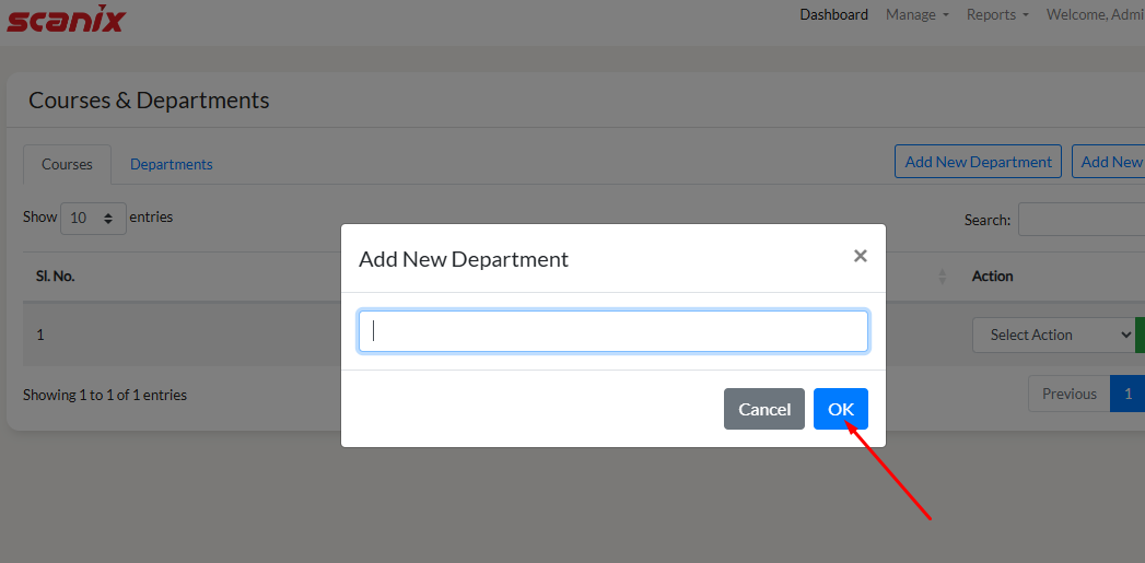 To add a new department, click on "Add New Department". A Pop-up will open. Write down the department name and click on "OK".
