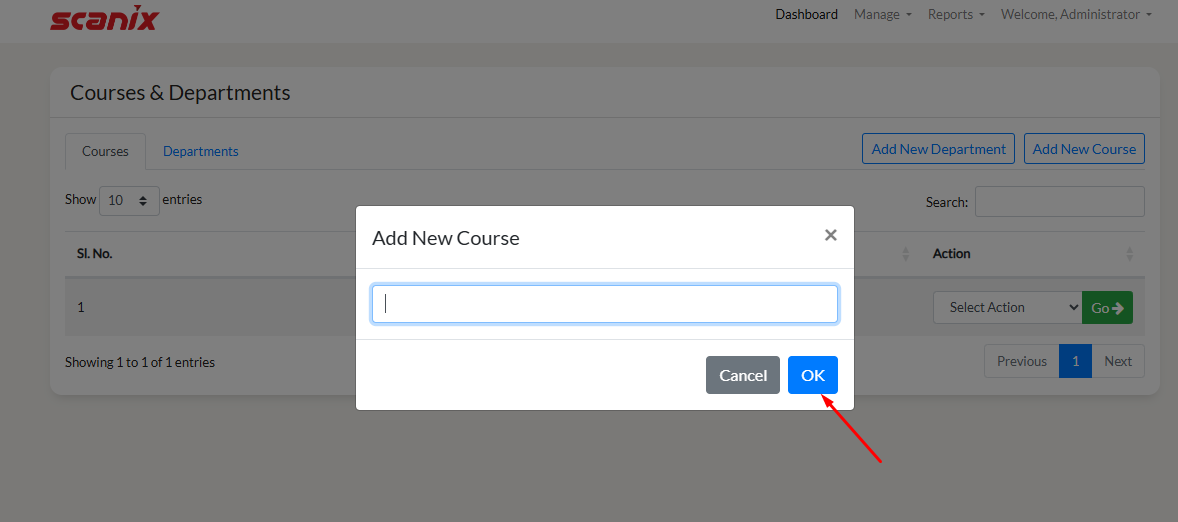 To add a new course, click on "Add New Course". A Pop-up will open. Write down the Course name and click on "OK".
