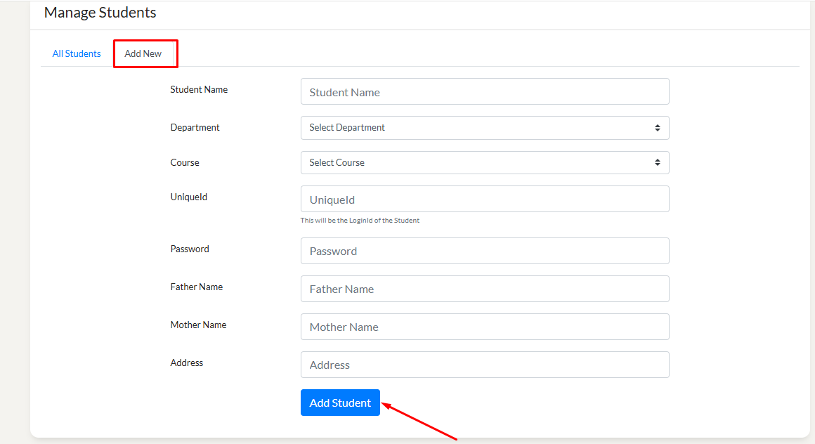 Click on "Manage" from the top right side menu. Then click on "Teacher". Here you check all Teacher details. To add new Teacher, click on "Add New".. Fill all the details and click on "Add Teacher".
