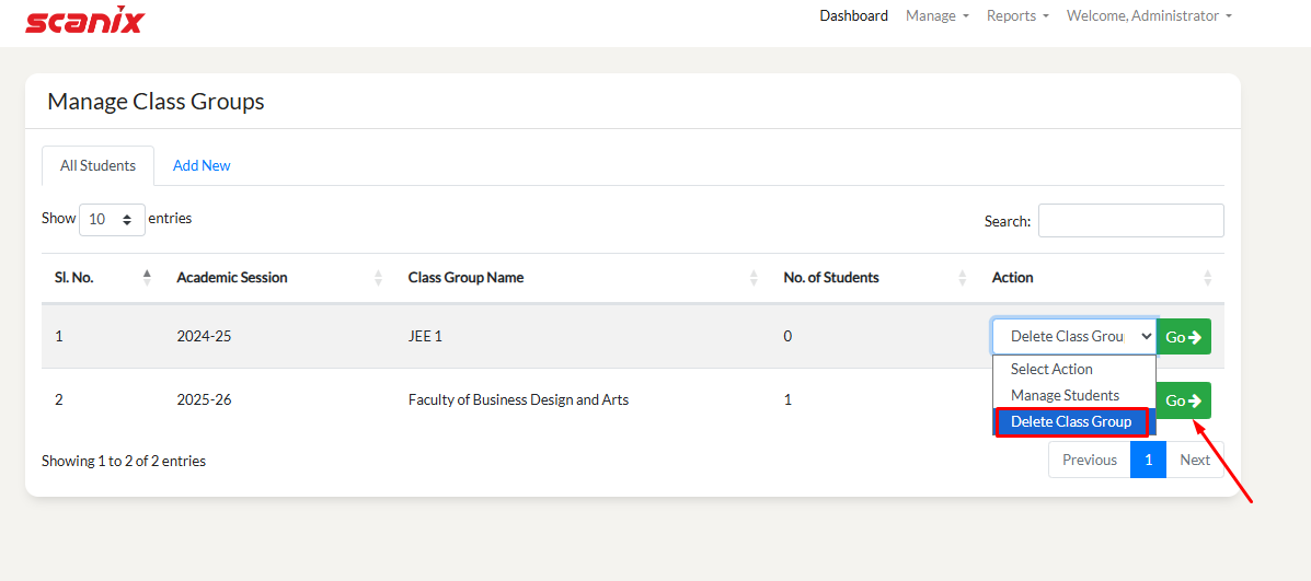 To Delete a Class Group, please click on the dropdown, then select "Delete Class Group" and click on the green button "Go".