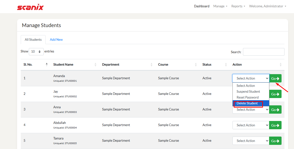 Click on "Manage" from the top right side menu. Then click on "Students". Here you check all Students details. To add new Student, click on "Add New".. Fill all the details and click on "Add Student".