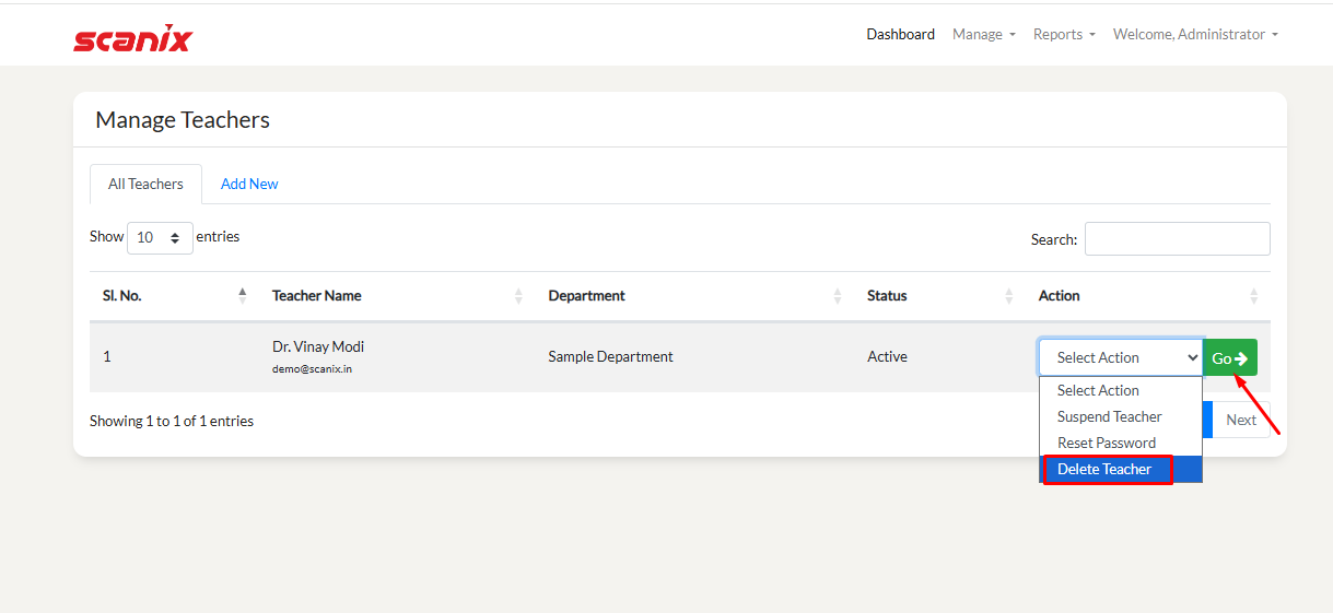 To Delete a teacher, please click on the dropdown, then select "Delete Teacher" and click on the green button "Go". Teacher will be deleted.
