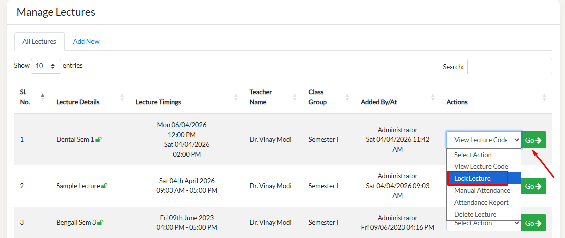 To view the QR code of a specific lecture, click on "View Lecture Code" and click on "GO". Then you can scan the QR with your mobile.