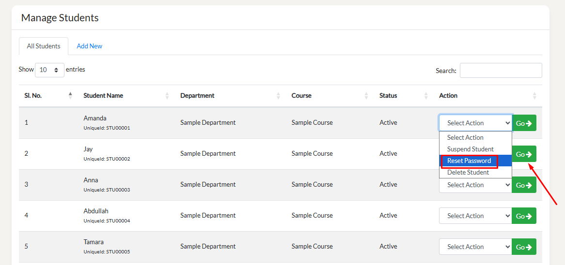 To reset the password of a Student, please click on the dropdown, then select "Reset Password" and click on the green button "Go".