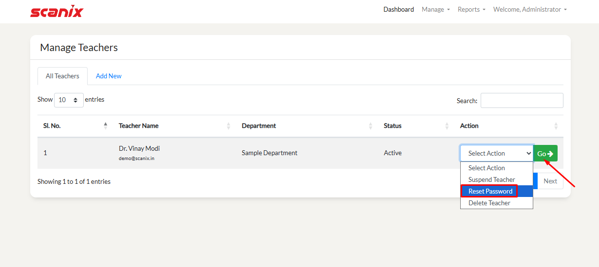 To reset the password of a teacher, please click on the dropdown, then select "Reset Password" and click on the green button "Go".