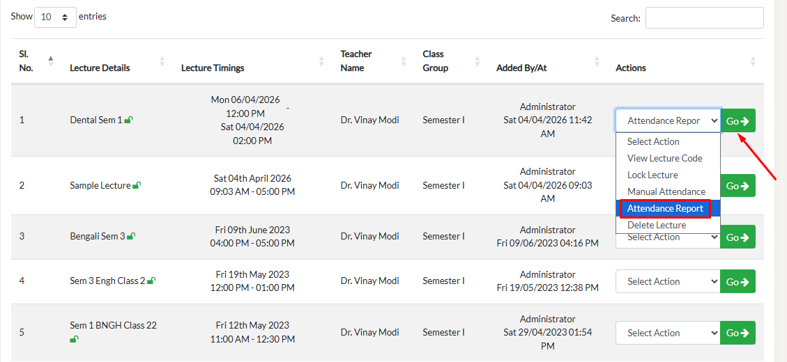 To take Manual Attendance, Click on "Manual Attendance" and then "Go". You can on/off the Attendance Status and take attendance.